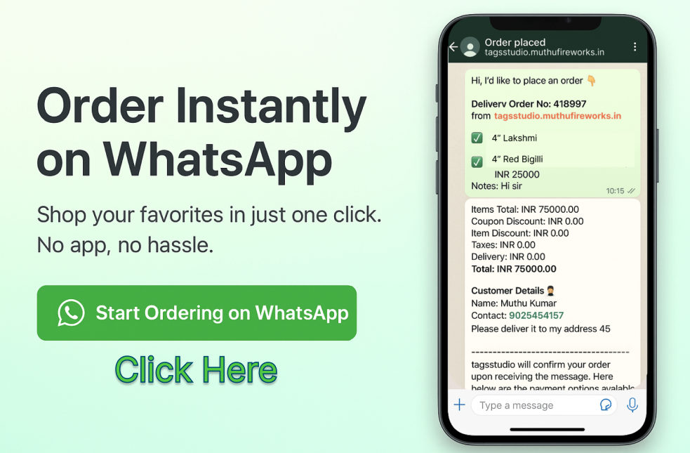 As per 2018 supreme court order, online sale of firecrackers are not permitted! We value our customers and at the same time, respect jurisdiction. We request you to add your products to the cart and submit the required crackers through the enquiry button. We will contact you within 24 hrs and confirm the order through WhatsApp or phone call. Please add and submit your enquiries and enjoy your Diwali with Muthufireworks.in & MaayonFireworks.in